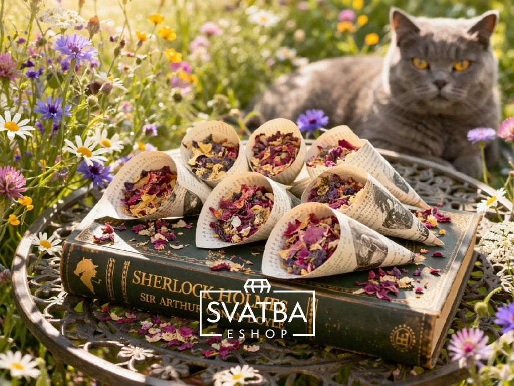 U nás v Svatba-eshop mají svatební konfety osobitější podobu. Kornoutky vyrábíme ze stránek starších knih, které už byly poškozené, a tak dostávají novou a krásnou roli. Každý kus je díky tomu jedinečný – někde se objeví text, jinde obrázek nebo část fotografie, takže žádné dva kornoutky nejsou stejné.