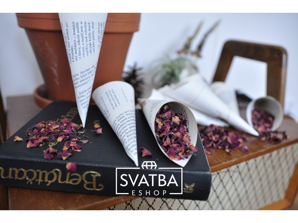Svatba-eshop vyrábí konfety trochu jinak. Využívá staré poškozené knihy, které mají příběh. Proto je každá strana jiná, obsahuje text nebo fotografii, každý kornoutek je originální.