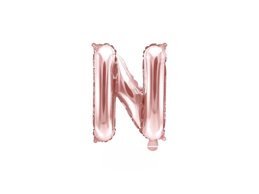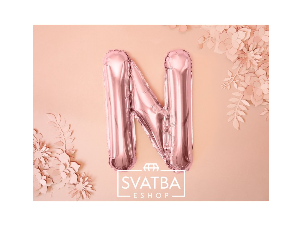Krásný fóliový růžovozlatý balónek písmeno "N". Písmena jsou vhodná k sestavení iniciálů novomanželů či k sestavení příjmení a krátkých vzkazů. Písmena můžete zavěsit za novomanžele ve svatebních prostorách nebo s nimi vyzdobit například fotokoutek.