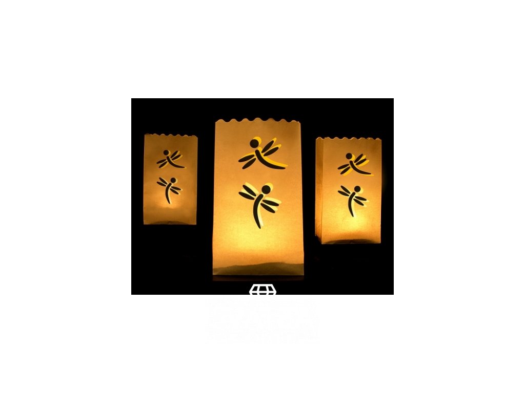 Lampionový sáček zdobený výsekem ve tvaru vážek je lampion určený pro stání na zemi. Lampionové sáčky jsou vhodné na svatební výzdobu - můžete jimi olemovat cestu, schody, náhodně je rozmístit po zahradě i je postavit na stůl. Stojací lampiony vytvoří nádhernou romantickou atmosféru. Lampiony jsou vhodné i na výzdobu zahradních oslav a party.