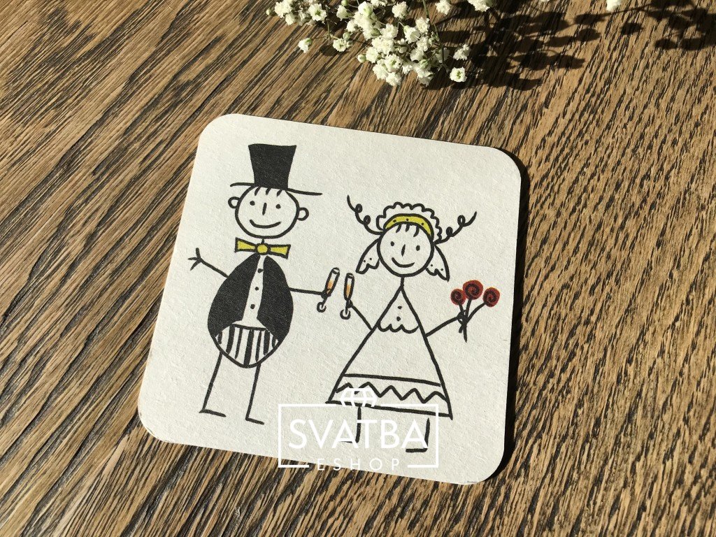 Svatební nápojový tácek hranatý se zaoblenými rohy s motivem nevěsty a ženicha při přípitku se šampaňským. Tácek je vyroben z kvalitní savé švédské lepenky.