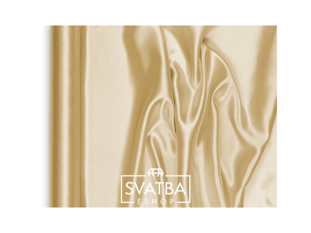 Satén v jemném zlatém odstínu o šíři 48 cm. Jemně se leskne, působí lehce a elegantně a dodá svatební výzdobě teplý, romantický nádech. Krásně vynikne na svatební tabuli, při dekorování i v detailních aranžích.