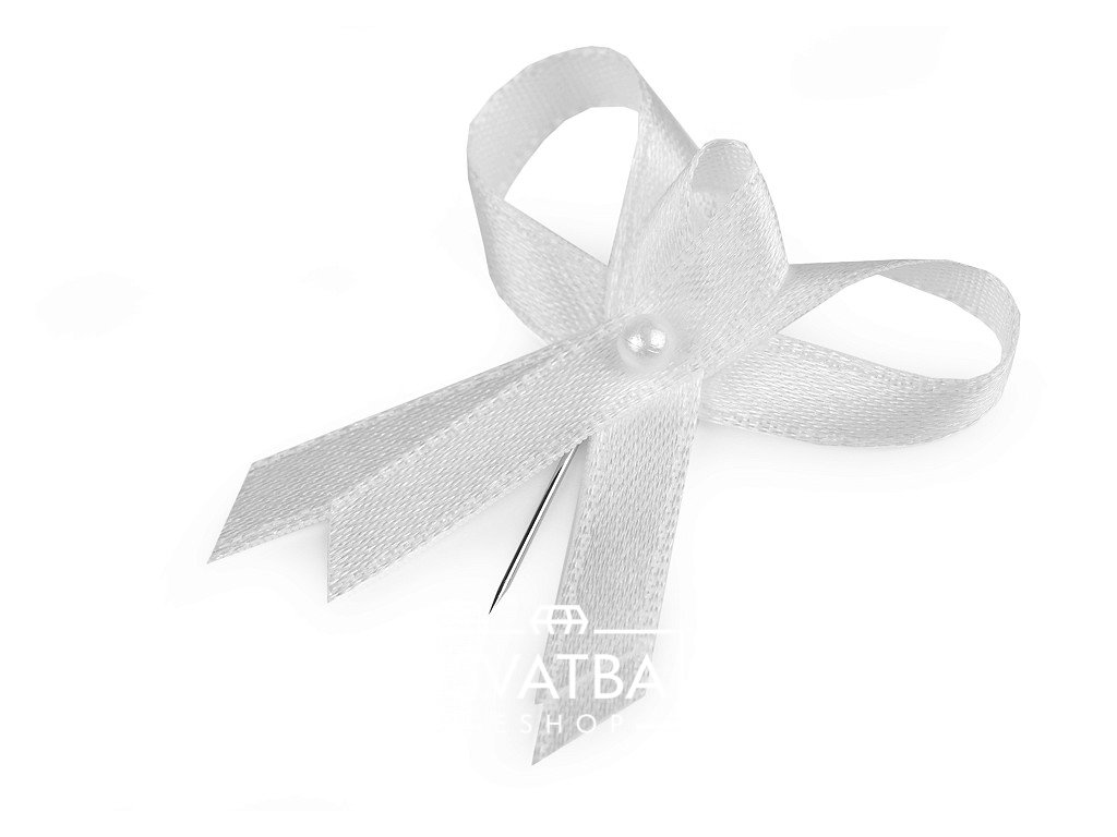 Svatební vývazek se skládá z 6 mm širokých bílých saténových stuh, bílé perleťové perličky a špendlíku.